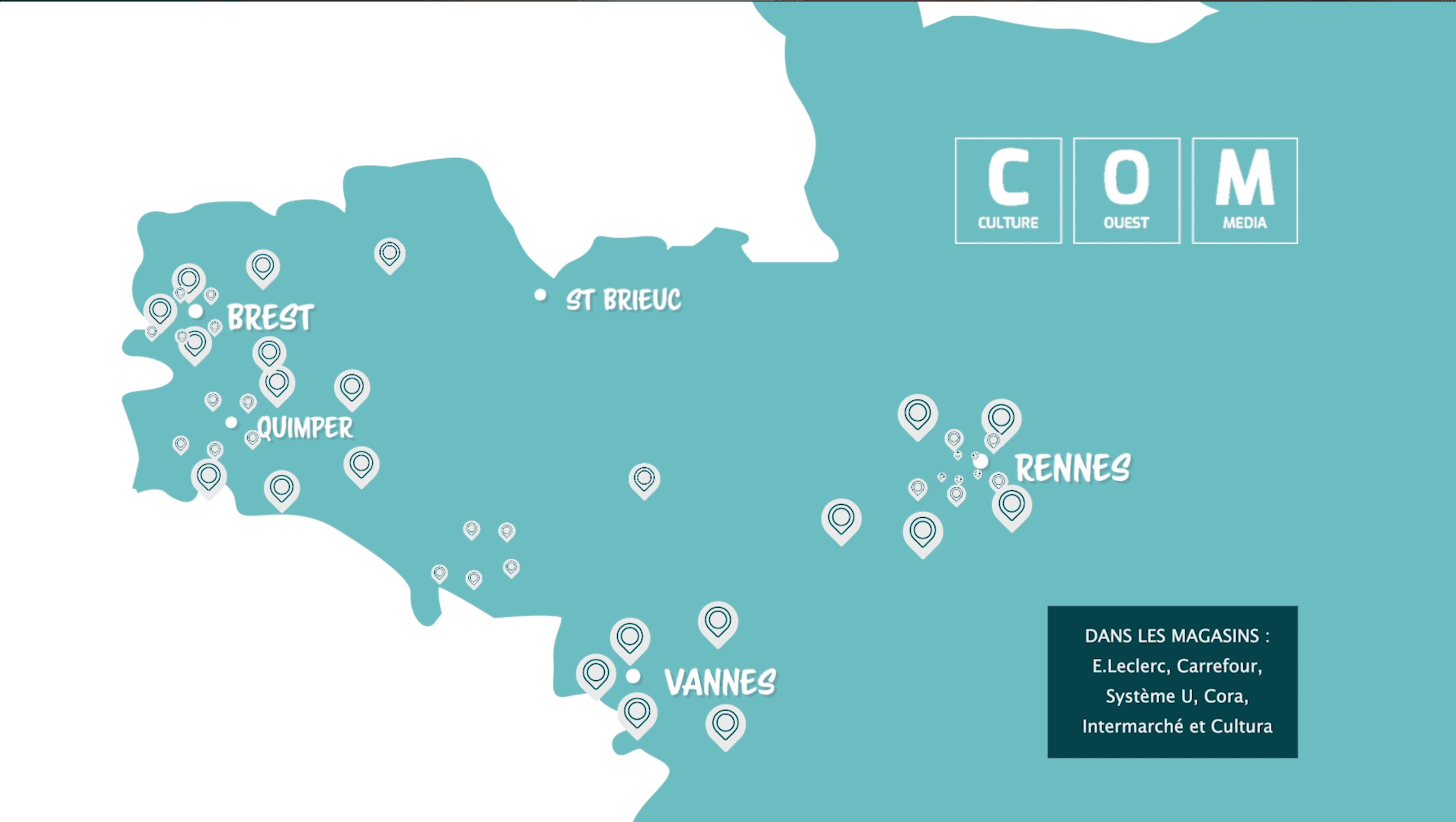 Découvrez notre réseau de présentoirs multimédias implantés exclusivement dans les grandes et moyennes surfaces en Bretagne (E.Leclerc, Carrefour, Système U, Cora, Intermarché, Cultura). Au total, ce sont plus de 70 présentoirs qui sont à votre disposition pour vos campagnes de communication hors médias. Présents dans près de 40 villes et communes de Bretagne, nous sommes notamment implantés sur les agglomérations de Rennes, Vannes, Brest, Saint-Brieuc et Quimper.